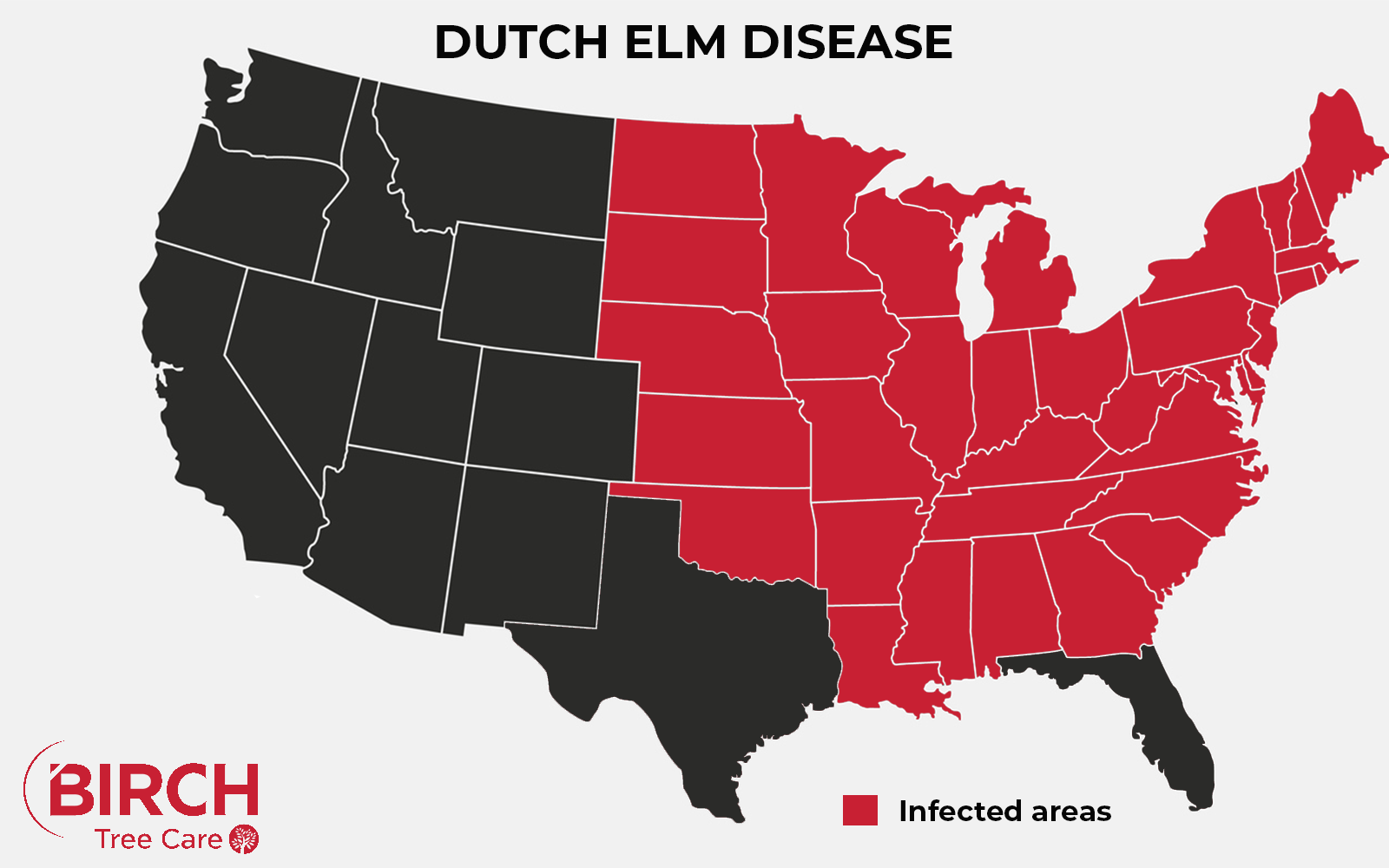 What are some initial signs of Dutch elm disease. But when a tree is diseased dark brown or red streaks can be seen in the infected sample. The native elm bark beetle and European elm bark beetle. DED symptoms can also be seen under the bark of infected branches. Elm bark beetles spread the DED fungus when feeding. All elm trees are deciduous trees. They have dark green veined leaves that are toothed and uneven at the base. Dutch Elm Disease has wiped out millions of Elm trees worldwide. The disease was first identified in the United States in 1930.