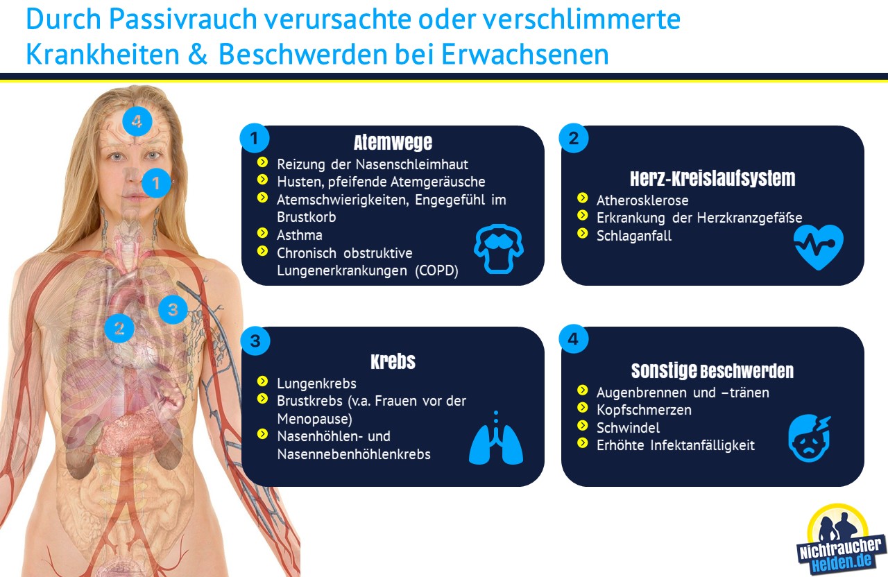 Doch nicht nur die Lymphome sind von dem schädlichen Zigarettenqualm betroffen. Atemnot Kurzatmigkeit und Atemwegserkrankungen wie Asthma und Bronchitis stehen in direktem Zusammenhang mit dem Passivrauchen. Passivrauchen ist nicht nur für unsere Mitmenschen schädlich.