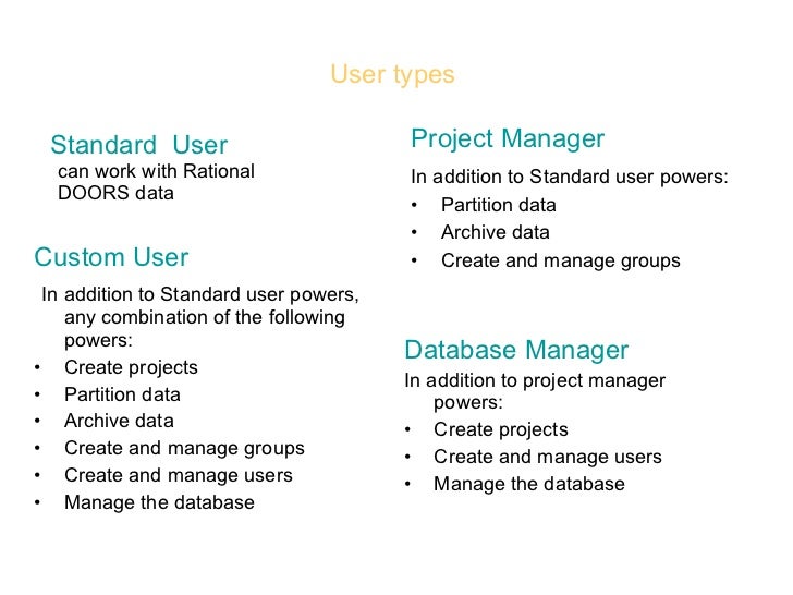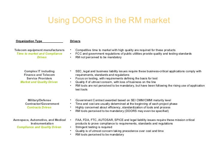 At the heart of the family is Rational DOORS an application that runs on Windows Linux and Solaris systems. IBM Rational Dynamic Object Oriented Requirements System DOORS is a requirements management RM software tool. DOORS Dynamic Object-oriented Requirements System is a multi-platform enterprise-wide requirements management system that allows users to incorporate a number of requirements in their product design production and delivery in order to ensure full compliance with specified standards.