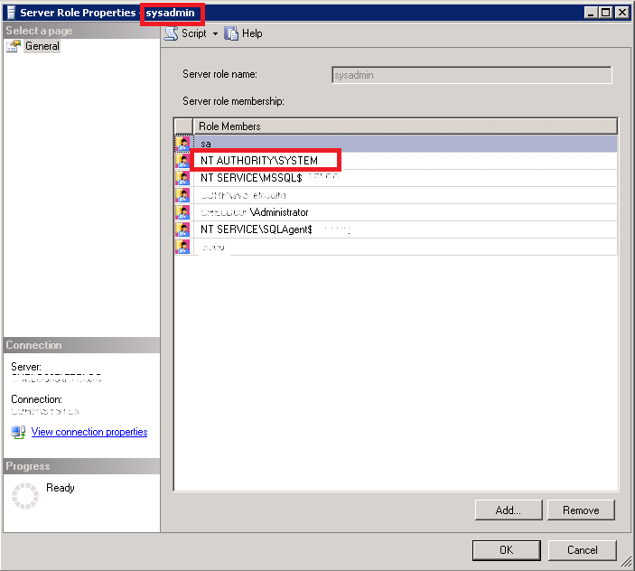 A DBA just sent a report to our data stewards and is planning to remove the NT AUTHORITYSYSTEM account from the sysadmin role on a bunch of. Sometimes it is needed to connect to SQL Server using System account.